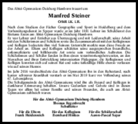 Das Abtei-Gymnasium Duisburg-Hamborn trauert um Manfred Steiner OStR i.K. i.R. Nach dem Studium der Fächer Geographie und Sport in Heidelberg und dem Vorbereitungsdienst in Speyer wurde er im Jahr…