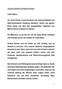 Johanna Stekkel (einleitende Worte) Liebe Gäste, wir, Emily Kleine, Laura Preußner und Johanna Stekkel vom Abtei-Gymnasium Duisburg Hamborn, fühlen uns geehrt, Ihnen heute aus dem hier…