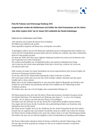 Preis für Toleranz und Zivilcourage Duisburg 2023 Ausgezeichnet werden die Schülerinnen und Schüler des Abtei-Gymnasiums mit der Aktion „Das Abtei vergisst nicht“ am 26. Januar 2023 anlässlich des…