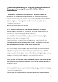 …..gerne habe ich zugesagt, heute am Vorabend des 27. Januar die Laudatio für die Bekanntgabe und Verleihung des diesjährigen Preises des „Duisburger Bündnisses für Toleranz und Zivilcourage“ zu…