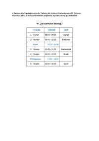 In Rahmen des Ganztags wurde die Taktung der Unterrichtsstunden vom 45 MinutenRhythmus auf 67,5 Minuten-Einheiten umgestellt, erprobt und für gut befunden. à „Ein normaler Montag.“ Stunde Uhrzeit …