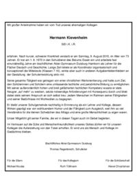 Mit großer Anteilnahme haben wir vom Tod unseres ehemaligen Kollegen Hermann Kievenheim StD i.K. i.R. erfahren. Nach kurzer, schwerer Krankheit verstarb er am Sonntag, 9. August 2015, im Alter von…